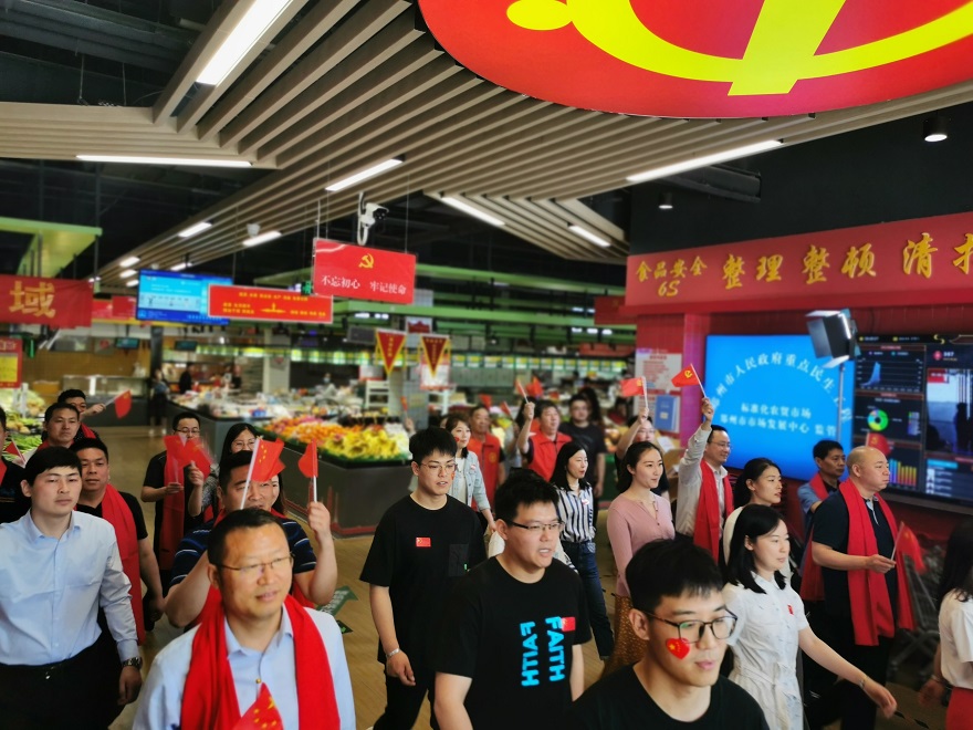 ? ? ? 上午9時,伴隨著悠揚(yáng)的音樂聲,公司員工一邊揮舞著手中的黨旗,一邊放聲歌唱,緩緩從喧鬧的市場中走出,一場持續(xù)約6分鐘的紅歌“快閃”活動讓濃濃的愛黨愛國情愫涌動在每個人的心里。活動現(xiàn)場,在音樂旋律的感染下,前來購物的市民以及市場商戶也從四面八方匯聚而來,有的掏出手機(jī)拍照,有的一起參與,深情的歌聲漸漸演變成大合唱,所有人用慷慨激昂、精神飽滿的歌聲表達(dá)出對偉大中國共產(chǎn)黨的真誠歌頌。大家用紅色的海洋、激昂的情感、高亢的歌聲,展現(xiàn)著新時代共產(chǎn)黨員的風(fēng)采。